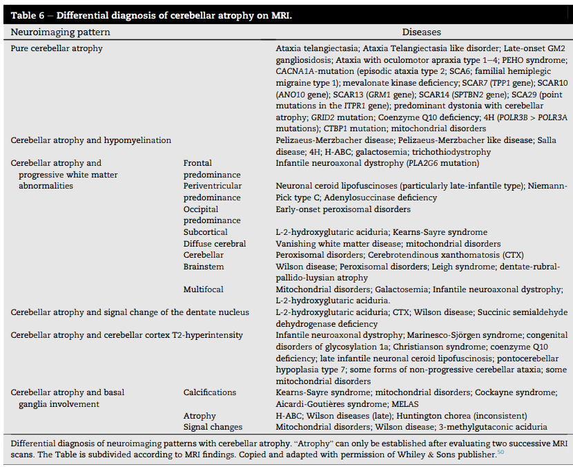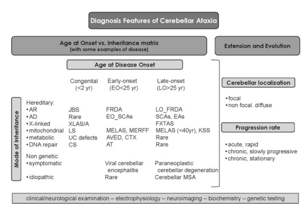 Palau F, Arpa J. Differential Diagnosis of Cerebellar Ataxias on the Basis of the Age at Onset. In: Gruol DL, Koibuchi N, Manto M, Molinari M, Schmahmann JD, Shen Y, editors. Essentials of Cerebellum and Cerebellar Disorders: A Primer For Graduate Students [Internet]. Cham: Springer International Publishing; 2016 [cited 2025 Feb 24]. p. 523–9. Available from: https://doi.org/10.1007/978-3-319-24551-5_70