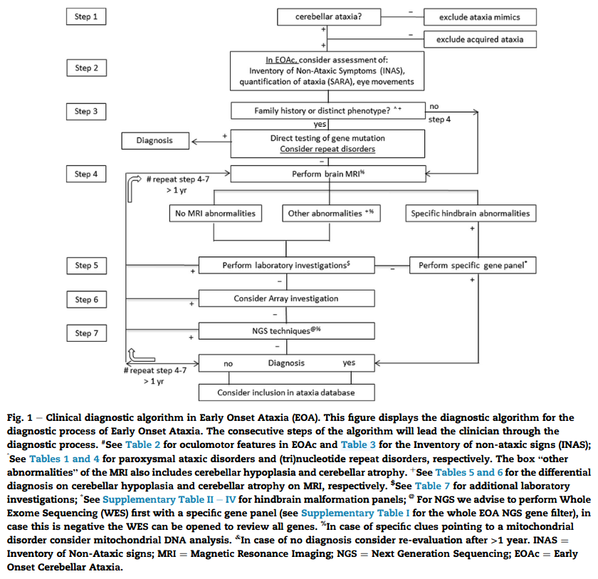 Brandsma R, Verschuuren-Bemelmans CC, Amrom D, Barisic N, Baxter P, Bertini E, et al. A clinical diagnostic algorithm for early onset cerebellar ataxia. European Journal of Paediatric Neurology [Internet]. 2019 Sept 1 [cited 2025 Feb 24];23(5):692–706. Available from: https://www.sciencedirect.com/science/article/pii/S1090379819300273