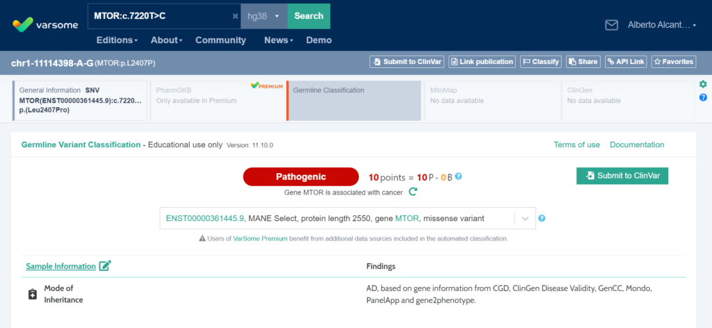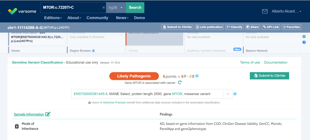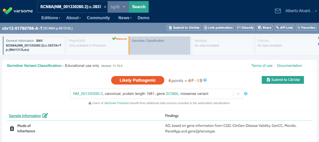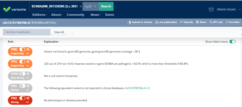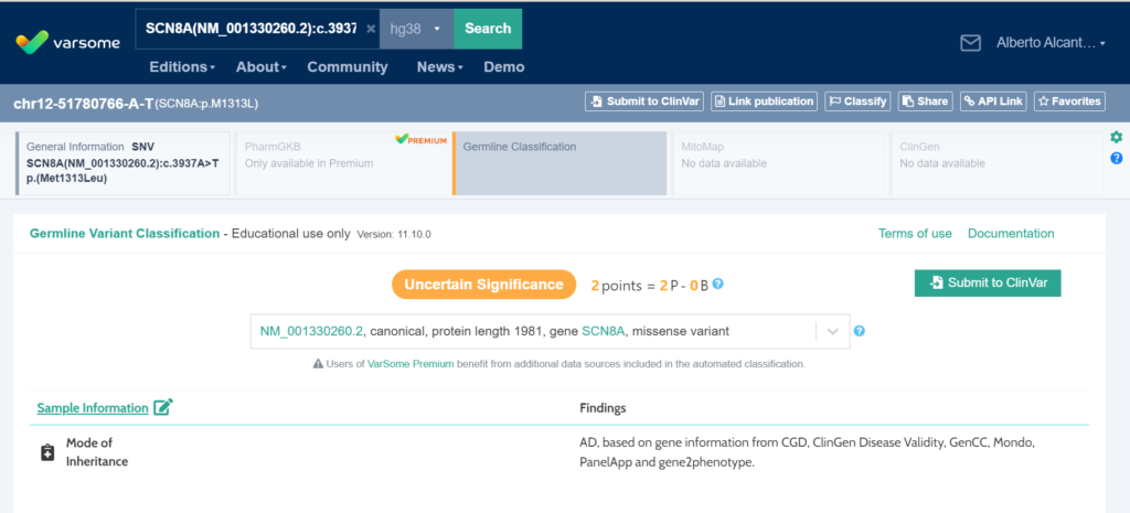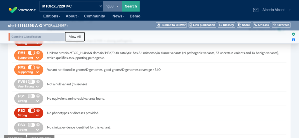• En este sentido, puede utilizarse Varsome, para evaluar la posibilidad de que una variante de significado incierto cambie de clasificación de patogenicidad si conseguimos demostrar su origen de novo, es decir, al cumplir los criterios PM6 o PS2.