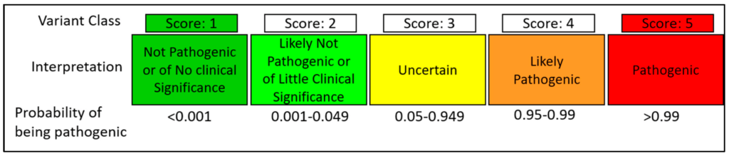 • La probabilidad de patogenicidad de una VSI se mueve en un rango muy elevado, entre el 5 y el 95%, por lo tanto no todas las VSI son iguales. Algunas están muy cerca de considerarse probablemente benignas, y otras cerca de reclasificarse como probablemente patogénicas. Es importante por lo tanto conocer el motivo por el que se ha clasificado como VSI, en particular, los criterios de la ACMG que cumple.