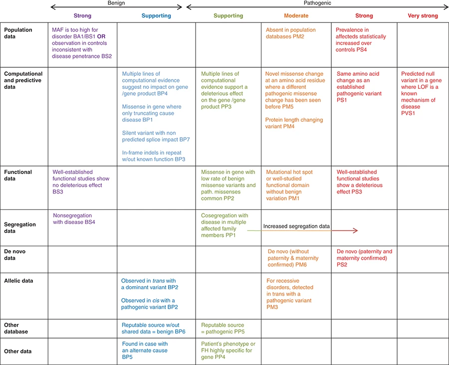 • La aparición de novo es un criterio de la ACMG utilizado en la clasificaciones de patogenicidad. Si el reanálisis produce una reclasificación de patogenicidad, puede ser clínicamente significativa o no serlo. Ésta es clínicamente significativa si produce un cambio desde VSI a probablemente patogénica.