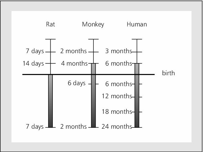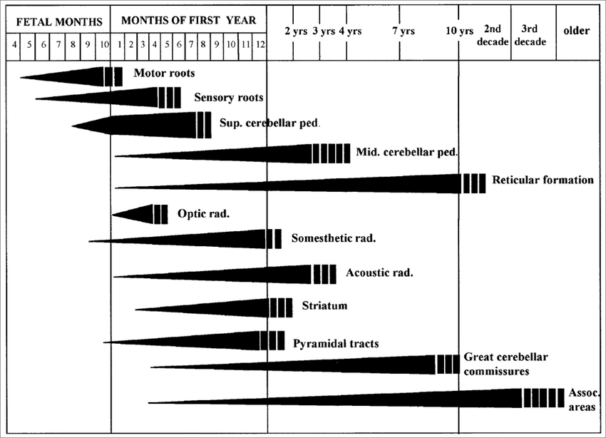 - Timeline of myelination in healthy human brain adapted from (Baumann and Pham-Dinh, 2001). Maturation of cognitive abilities occurs in synchrony with myelination of corresponding white matter pathways.